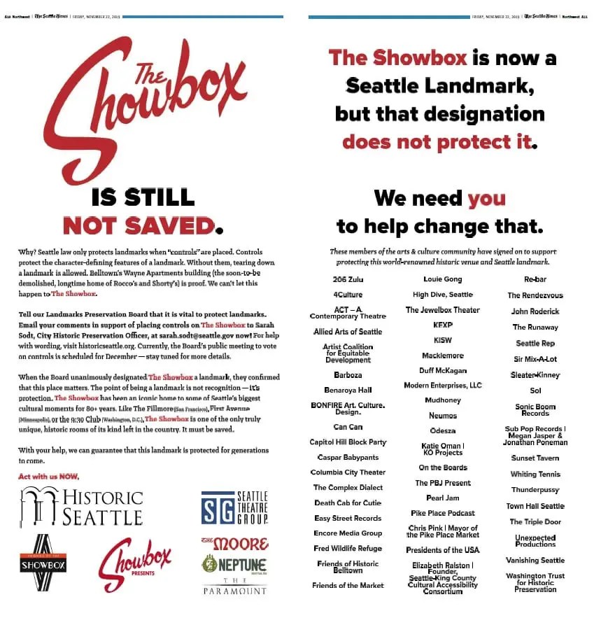Historic Seattle, an advocacy group, played arguably the most significant role in communication during this crisis. They curated an open letter published in the Seattle Times with more than 150 local and international artist’s signatures of support. They regularly posted updates on the landmarks process on their mailing list, website, and social media. They created materials such as a FAQ sheet regarding the crisis, an infographic reflecting Showbox’s history and significance, and tear sheets to put in magazines and newspapers that briefly state the crisis, the supporters, and the call to action.