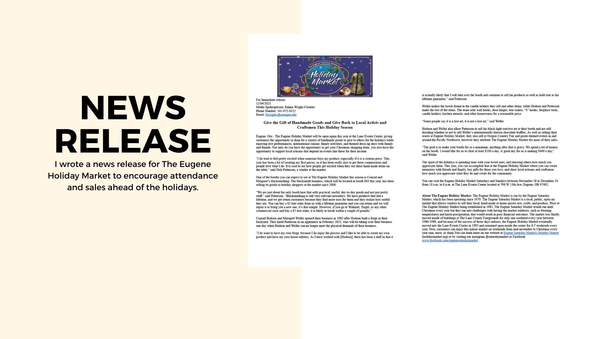 I made a PR Media Kit in J352 Strategic Writing and Media Relations for The Eugene Holiday Market in 2023.